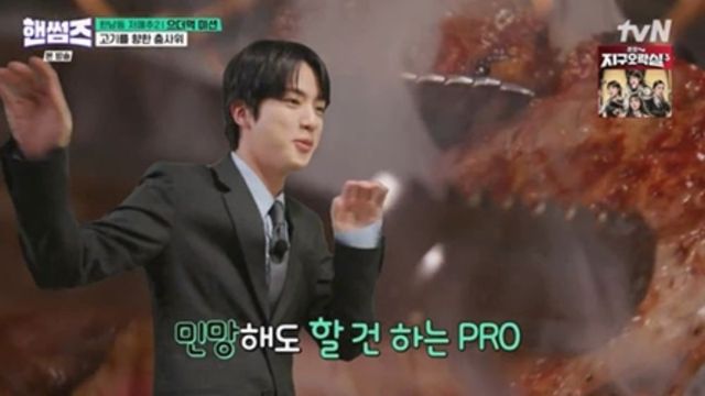 지난 15일 tvN ‘핸썸가이즈’에 진이 등장했다. 이날 진은 차태현, 김동현, 이이경, 신승호, 오상욱과 함께 서울 한남동 지역의 점심-저녁 메뉴 추천 원정에 나섰다.