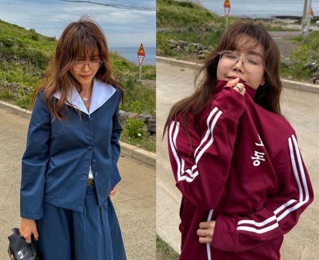 공개된 사진 속 채정안은 '폭싹 속았수다' 속 박보검이 생각나는 추리닝을 입고 있으며, 이어지는 사진에서는 아이유가 떠오르는 옛날 교복을 입고 있어 눈길을 끈다.