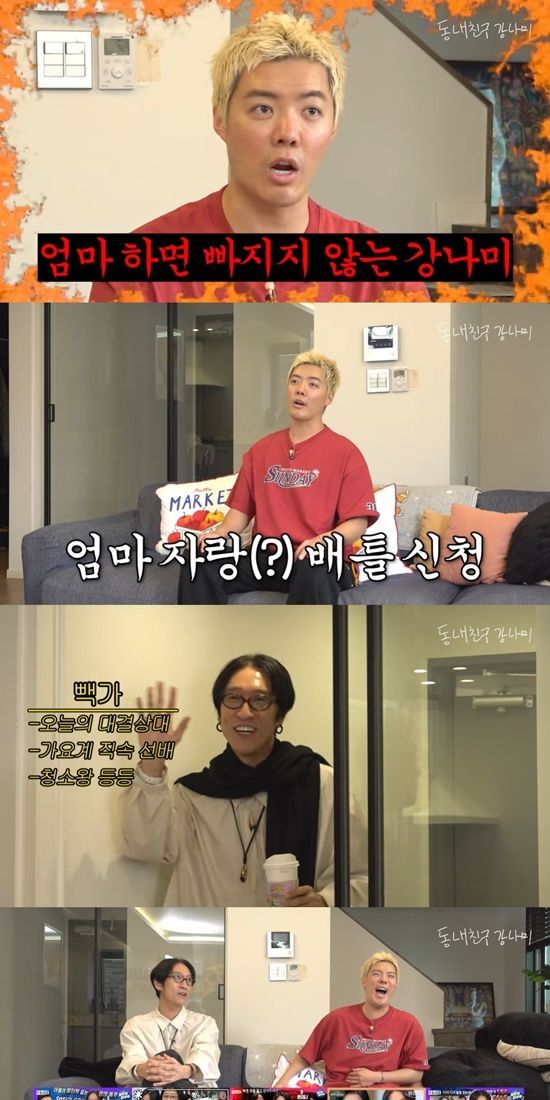 강남은 "근데 우리 엄마도 사실 비슷한 느낌이다. 스토리가 많다. 그래서 형 영상보다가 이거는 대결해야겠다고 생각했다. 우리 엄마가 더 세다 배틀"이라며 빽가에게 도전장을 내밀었다.