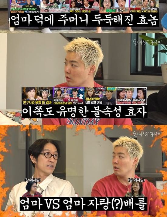 강남은 "오늘 좀 긴장하고 있습니다. 직속 윗사람이 온다고 한다. 가수 선배다"라며 게스트에 대한 기대감을 내비쳤다. 그는 "이 형이 방송에서 어머님 얘기를 많이 한다. 많이 살벌하시다. 근데 우리 엄마도 살벌하다. 그래서 대결을 하려고 한다"며 모인 이유를 설명했다.
