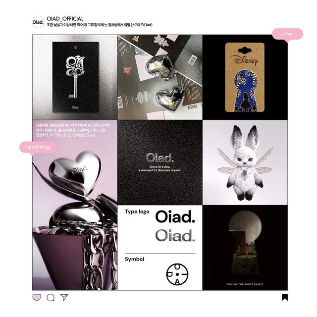 앞서 말한 오아드의 매력을 감각적으로 풀어내기 위해 자료를 찾다가 우리에게 익숙한 고전 동화 〈이상한 나라의 앨리스〉가 떠올랐다. 이야기 속의 소재와 디테일을 오아드만의 방식으로 ‘긱’하게 재해석해 세계관을 정립하고 싶었다. 앨리스를 이상한 나라로 이끈 시계 토끼는 더 자유롭고 ‘힙’한 무드의 ‘오디 버니(Oddy Bunny)’로 다시 태어나 소비자들을 오아드의 세계로 안내하는 마스코트가 됐고, 황금 열쇠는 신비로운 무드의 실버빛 열쇠로 재창조됐다. 그 외에도 앨리스를 모티프로 한 수많은 상상력의 조각을 기획 전반에 녹여냈다.