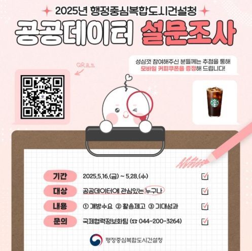 이번 설문조사는 국민의 수요를 정확히 파악하여 맞춤형 공공데이터 정책을 수립하기 위한 것으로, 조사항목은 ▲공공데이터 이용 경험, ▲필요한 데이터 분야 및 항목, ▲데이터 제공 방식 선호도, ▲공공데이터 기반 서비스 제안 등 총 12개의 문항으로 구성되어 있다. 공공데이터에 관심 있는 국민이라면 누구나 행복청 누리집과 공식 에스엔에스(블로그, 페이스북, 인스타그램, 유튜브, 엑스)를 통해 참여할 수 있다.