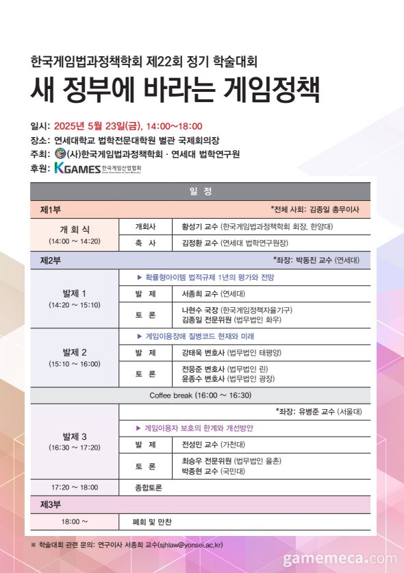 이번 행사는 한국게임법과정책학회가 주최하고 연세대학교 법학연구원이 공동 주최하며, 한국게임산업협회가 후원한다.