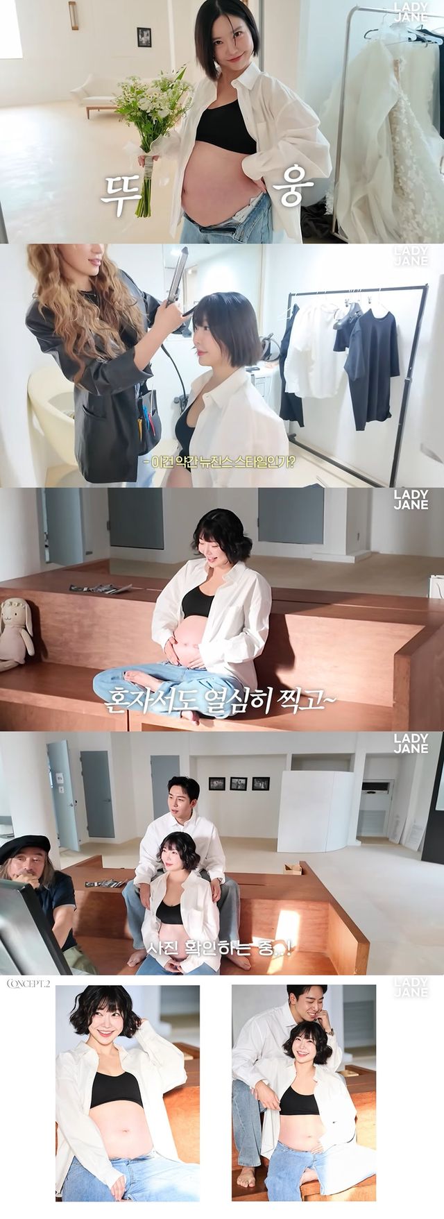 그는 남편과 함께 메이크업을 받은 후, 과거 웨딩 촬영을 진행했던 스튜디오를 찾아 만삭 화보 촬영을 시작했다. 첫 번째 콘셉트는 블랙 드레스였고, 이를 본 남편은 "예쁘다"며 칭찬하자 레이디 제인은 "배 많이 나왔지"라며 웃어 보였다.
