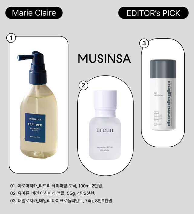 에디터가 무신사 뷰티 페스타 팝업 스토어를 체험한 후 픽한 제품은 바로 아로마티카의 티트리 퓨리파잉 토닉, 더말로지카의 데일리 마이크로폴리언트, 유아른의 비건 아하파하 앰플입니다.