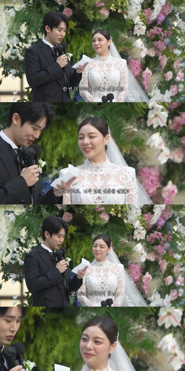 이어 신랑 최시훈의 깜짝 이벤트가 이어졌다. 양복 안주머니에서 준비한 편지를 꺼낸 그는 "제가 굉장히 내성적이어서 와이프가 여러가지 해달라고 했던 게 있었는데 아무것도 못 해줘서 너무 미안하기도 해서 작은 이벤트 준비했다"고 말문을 열었다.