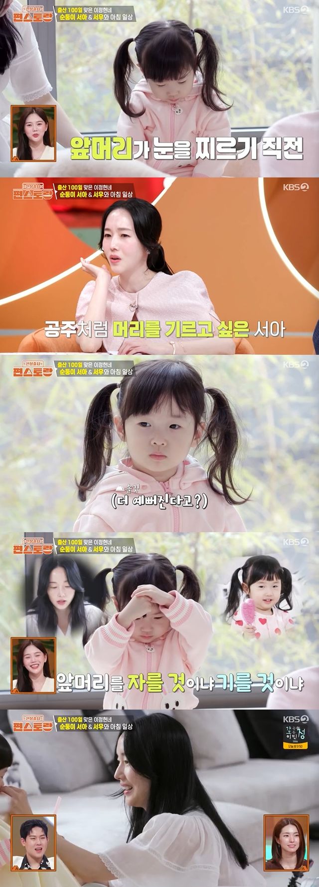 이날 출산 100일을 맞은 이정현네 순둥이 서아, 서우의 아침 일상이 공개됐다. 이정현은 서아에게 앞머리를 자르자고 제안했지만, 서아는 단호히 "앞머리 안 잘라"라고 거부했다.