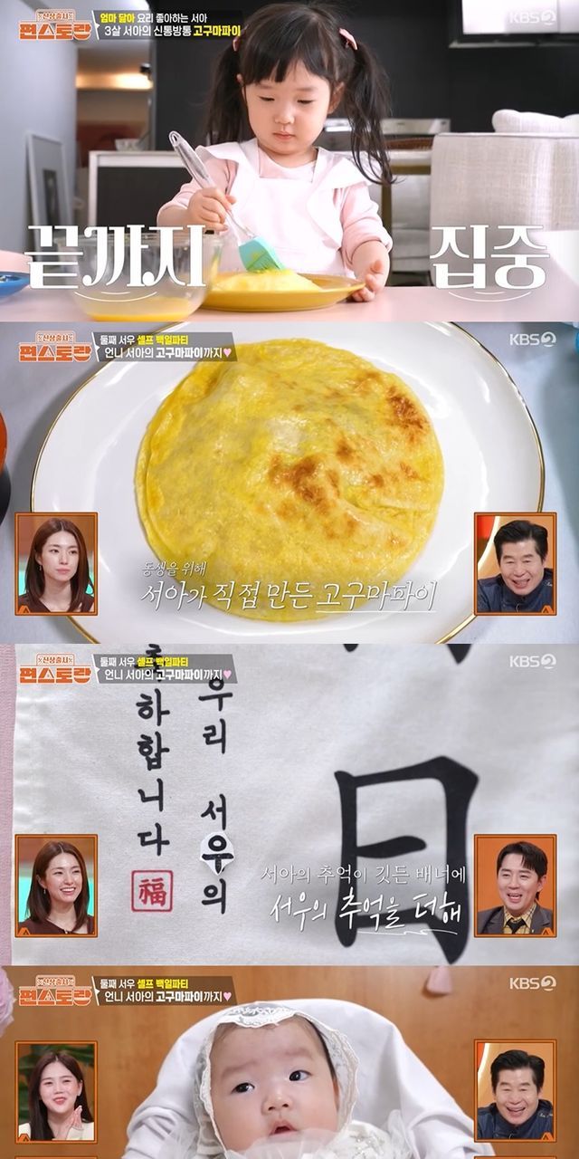 이정현은 둘째 딸 서우의 백일을 맞아 서아와 함께 직접 백일상을 준비했다. 두 사람은 커플 앞치마를 맞춰 입고 요리에 나섰고, 서아는 고구마파이를 직접 만드는 데 도전했다.