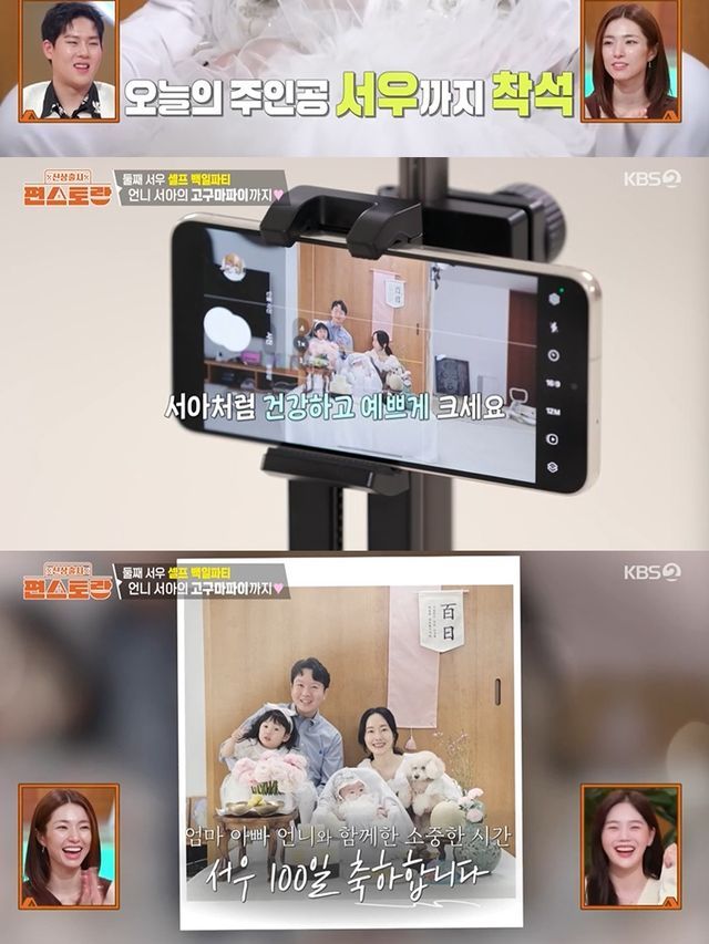 과거 첫째 서아의 백일상도 손수 준비했던 이정현은 당시 사용했던 배너를 재활용해 이름만 ‘서우’로 바꿔 사용하는 알뜰한 면모를 보였다. 서아가 정성껏 만든 고구마파이와 백일떡 등으로 백일상이 완성됐다.