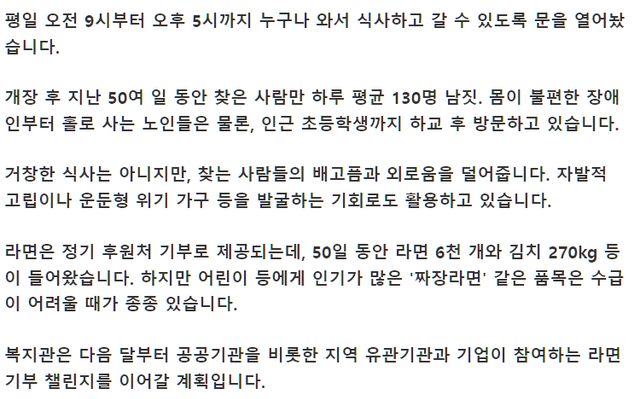 단순히 끼니 해결하는 곳이 아니라고립된 사람들이 문열고 밖으로 나와서 소통할 수 있는 만남의 광장이 되었음