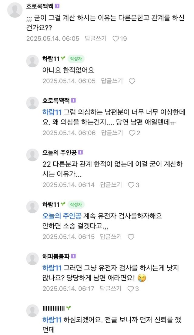 전남친 몰래 만나다 걸려서남편이 이혼하자고 하면서 애기 친자검사도 하자고 하니안하고 버티고있다함