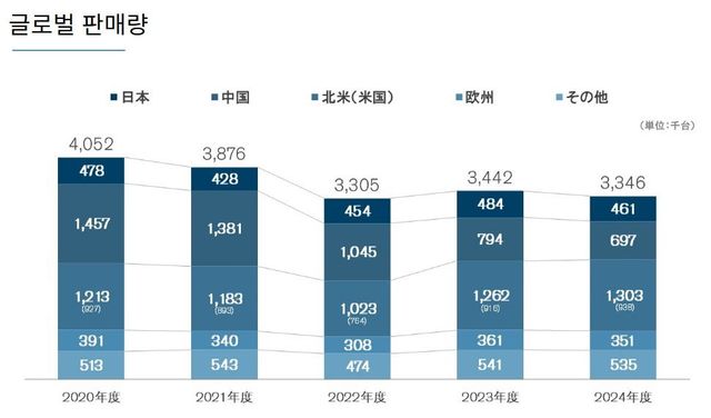 닛산의 2020~2024년 글로벌 판매량. 2023년 판매량이 약간 늘면서 기대를 모았지만 2024년 다시 334만6000대로 줄었다. 닛산 제공