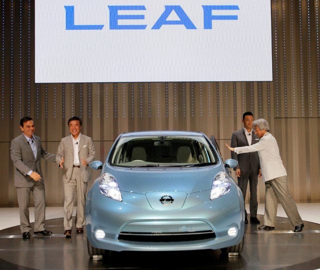 세계 최초 양산형 전기차 ‘리프’ 출시 행사장에 참석한 카를로스 곤 당시 닛산자동차 CEO(맨 왼쪽). 카를로스 곤은 취임 직후 닛산의 전기차 개발팀을 해체시켰지만, 2007년 다시 멤버들을 소집해 “프리우스와의 정면 승부다”라며 3년 안에 전기차를 개발해 출시하라고 지시한다. 배터리부터 새로 만들어야 하는 ‘맨땅에 헤딩’이라 매우 촉박한 일정이었지만, 놀랍게도 닛산 엔지니어들은 이 불가능한 미션을 성공시켰다. 동아일보 DB