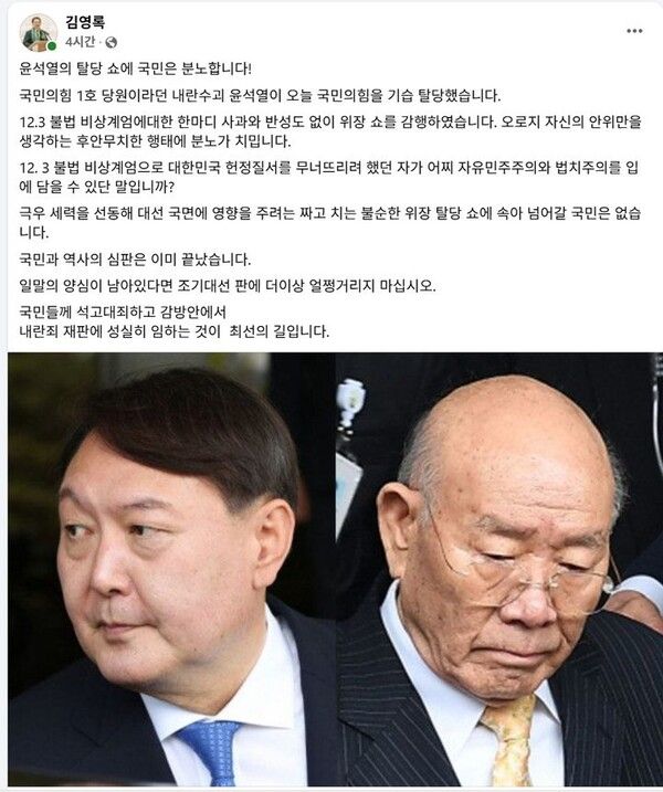 뉴시스 보도에 따르면, 김 지사는 이날 페이스북 글을 통해 "국민의힘 1호 당원이라던 내란 수괴 윤석열이 오늘 국민의힘을 기습 탈당했다"며 "12·3 불법 비상계엄에 대한 한 마디 사과와 반성도 없이 위장 쇼를 감행했다"고 비판했다.