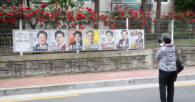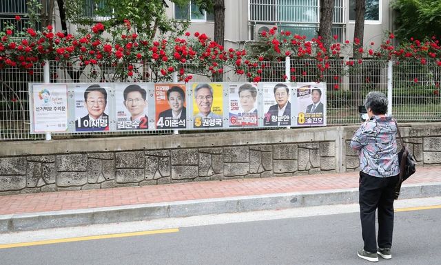 15일 오후 대구 중구 남산동 한 아파트 울타리에 곱게 핀 장미꽃 아래 제21대 대통령 선거에 출마한 후보자들의 선거 벽보가 붙어 있다. 한 시민이 선거 벽보를 휴대전화 카메라로 촬영하고 있다. / 뉴스1