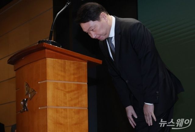최태원 SK그룹 회장이 7일 오전 서울 중구 SK텔레콤 T타워 SUPEX홀에서 진행된 유심 정보 유출 관련 일일 브리핑에서 허리 숙여 대국민 사과를 하고 있다. 사진=강민석 기자 kms@newsway.co.kr