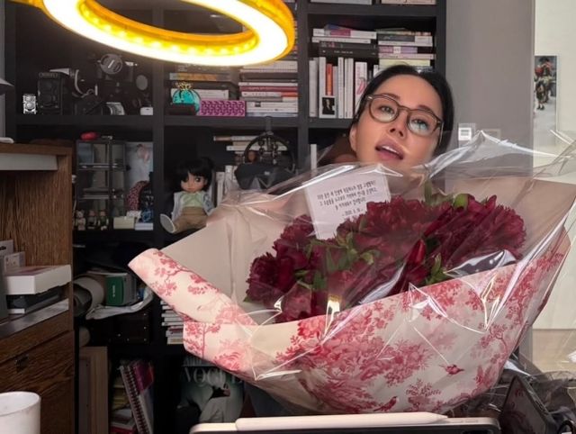 함께 공개한 사진에는 엄정화가 큰 꽃다발을 안고 있는 모습이 담겼다 .