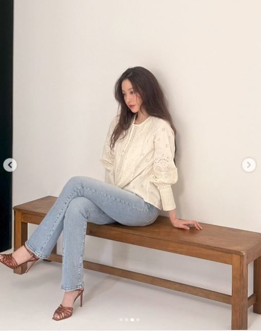 거기에 더한 건 연청 데님. 과하지 않은 워싱에 슬림 스트레이트 핏. 이것만으로 진짜 말 다 했다. 무심한 듯 앉아 있어도 다리가 길어 보이고, 자연스러운 블라우스 셔링 덕분에 전체 비율이 안정적으로 맞춰진다. 액세서리는 없고, 메이크업은 거의 안 한 듯 자연스럽다. 그런데 더 예쁘다. 이게 진짜 ‘꾸안꾸’다.
