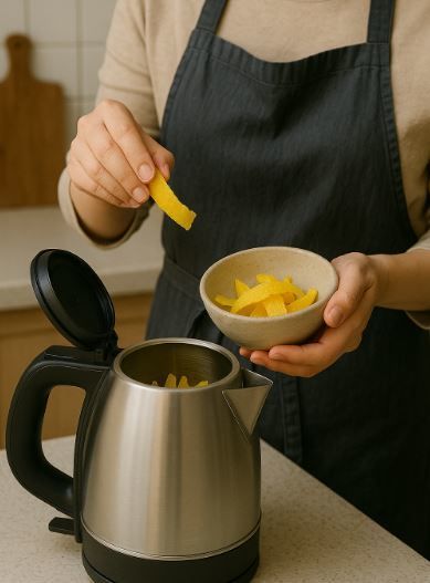 레몬껍질에는 ‘시트랄’, ‘리모넨’ 등 천연 방향성 오일이 풍부하게 함유되어 있다. 이 성분들은 항균, 탈취, 세정 작용이 뛰어나 오래된 냄새나 묵은 물때 제거에 효과적이다. 전기포트 내부에 물때가 생기거나 금속 특유의 냄새가 날 경우, 레몬껍질을 넣고 물을 끓이면 산 성분이 금속 산화물을 분해하면서 찌든 때를 부드럽게 제거해준다. 특히 주전자 바닥에 하얗게 남는 석회질 물때를 제거하는 데 효과가 있으며, 향긋한 레몬 향으로 냄새 제거 효과까지 누릴 수 있다.