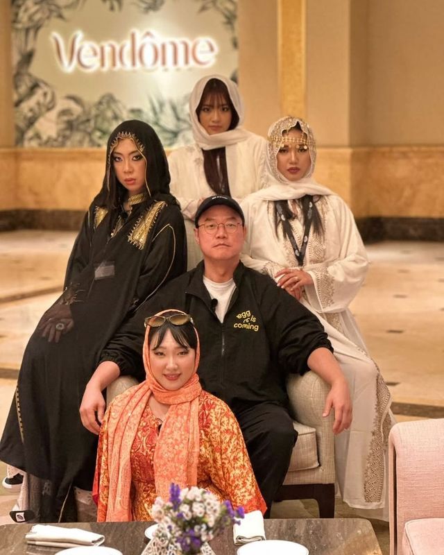 공개된 사진에는 tvN 예능 ‘뿅뿅 지구오락실3’ 출연진인 이은지, 미미, 이영지, 안유진과 나영석 PD가 함께 포즈를 취했다. 멤버들은 아부다비 촬영 당시 현지 전통 의상을 입고 근엄한 표정으로 카메라를 응시하는 모습이다. 특히 가운데 왕좌처럼 보이는 자리에 앉은 나영석 PD는 양팔을 넓게 벌리고 진지한 표정으로 시선을 사로잡았다. 전통 복식과 의외의 분위기가 어우러져 코믹하면서도 강렬한 인상을 남겼다.