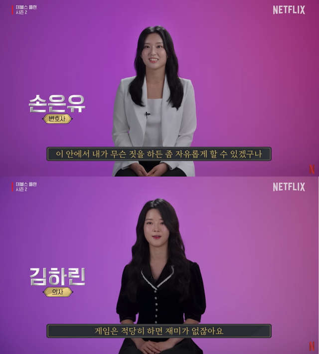 손은유와 김하린은 일반인 참가자로 발탁됐지만 스펙이 평범하진 않다. 손은유는 기업 인수합병 전문 변호사이며, 김하린은 성형외과 의사다. ‘사’자 직업은 ‘더 지니어스’ 등 정종연 PD의 전작에도 출연해 흥미로운 볼거리를 더했던 패다. ‘데블스 플랜’의 시즌1에선 서동주가 암기력으로 홀로 라운드를 종결시킨 에피소드가 지금까지 레전드로 손꼽힌다.