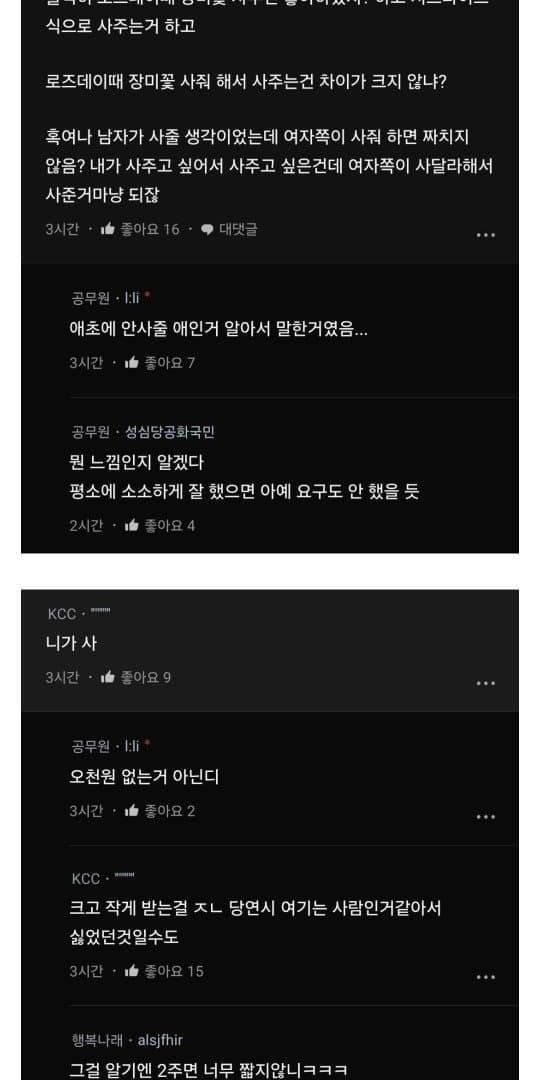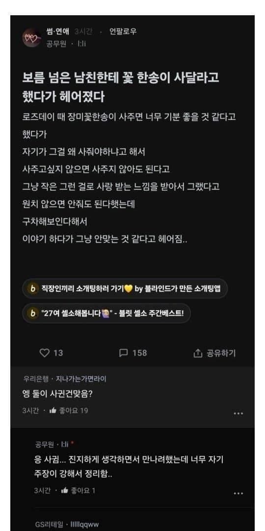 보름 사귄 남친한테 꽃 한송이 사달라고 했다가 헤어짐