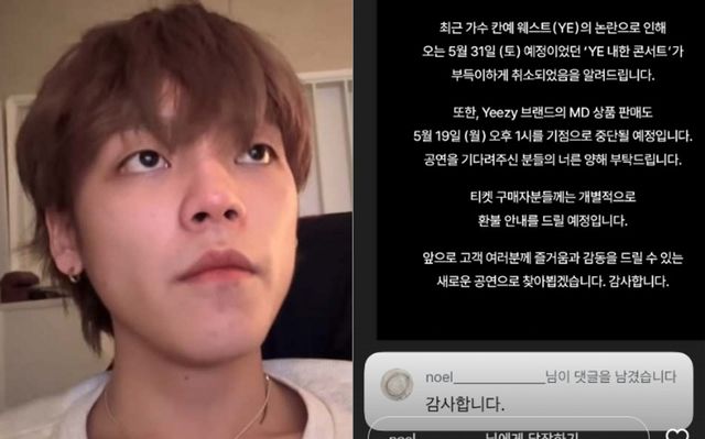 노엘은 19일 자신의 계정에 쿠팡플레이가 발표한 칸예 웨스트 내한 콘서트 취소 소식을 공유하며 “감사합니다”라는 짧은 메시지를 남겼다.
