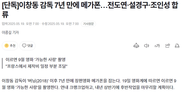 영진위가 공개한 예비 심사 통과작 목록에서 이 영화는 '국제 공동제작'으로 분류돼 있다. 한 영화계 관계자는 "프랑스의 배급·제작사에서 내년 칸국제영화제 출품을 목표로 제작비의 일정 부분을 조달한다"고 전했다. 이 감독의 친동생이기도 한 이준동 파인하우스필름 대표는 "아직 제작 초기 단계다. 모든 가능성을 열어두고 있다"고 말했다.