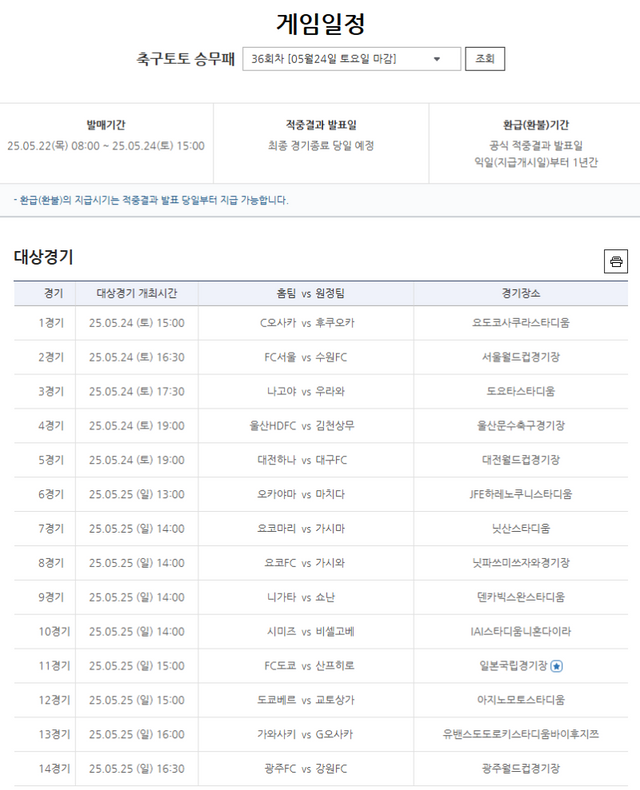 이번 회차는 국내 프로축구(K리그) 및 일본 프로축구(J리그) 주요 경기를 대상으로 진행되며, 주요 매치업으로는 ▲FC서울-수원FC(2경기) ▲대전하나시티즌-대구FC(5경기) ▲광주FC-강원FC(14경기) 등이 포함되어 있다.