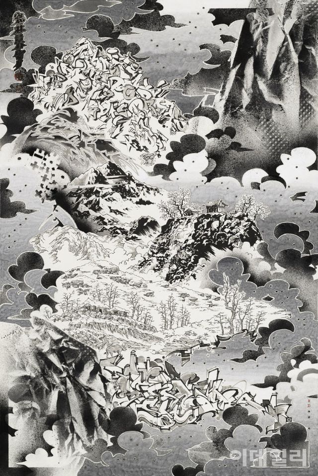 11월 27일까지 서울 종로구 필운대로 이상범가옥서 여는 개인전 ‘석양에 내려앉은 눈’에서 볼 수 있다. ‘전통의 현대적 변용’이란 의미를 심은 전시다. 종이에 먹·잉크·크레용·인주. 194×130㎝. 김달진미술자료박물관 제공.