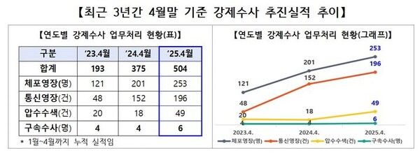 뉴시스 보도에 따르면, 고용부는 올해 4월 기준 임금체불 사건에 대한 구속수사, 체포영장 집행 등 강제수사 실적이 504건에 달한다고 19일 밝혔다. 이는 지난해 4월 375건보다 34.4% 증가한 수치다. 2023년 4월(193건)과 비교하면 2.6배 늘었다.