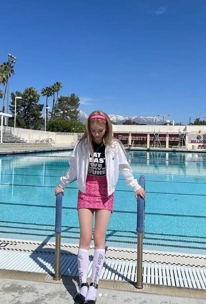 푸른 하늘과 수영장을 배경으로 한 이 전신샷은 룩에 담긴 ‘헬시+하이틴 무드’를 제대로 살렸다. 톡 튀는 컬러의 대비, 균형 잡힌 실루엣, 레트로 감성까지. ‘Too spicy’라는 말이 딱이다.