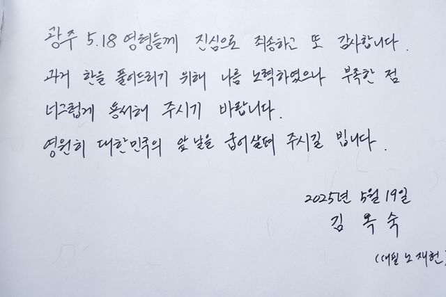 김 여사는 방명록에 '광주 5·18 영령들께 진심으로 죄송하고 또 감사합니다. 과거 한을 풀어드리기 위해 나름 노력하였으나 부족한 점 너그럽게 용서해 주시기 바랍니다. 영원히 대한민국의 앞날을 굽어살펴 주시길 빕니다'라고 남겼다. 거동이 불편한 김 여사의 방명록은 아들 노재헌 씨가 대필했다.