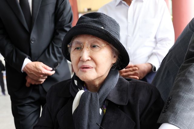 고(故) 노태우 전 대통령 부인 김옥숙 여사가 19일 광주 북구 운정동 국립 5.18민주묘지 참배를 마치고 취재진 질문을 듣고 있다. / 연합뉴스