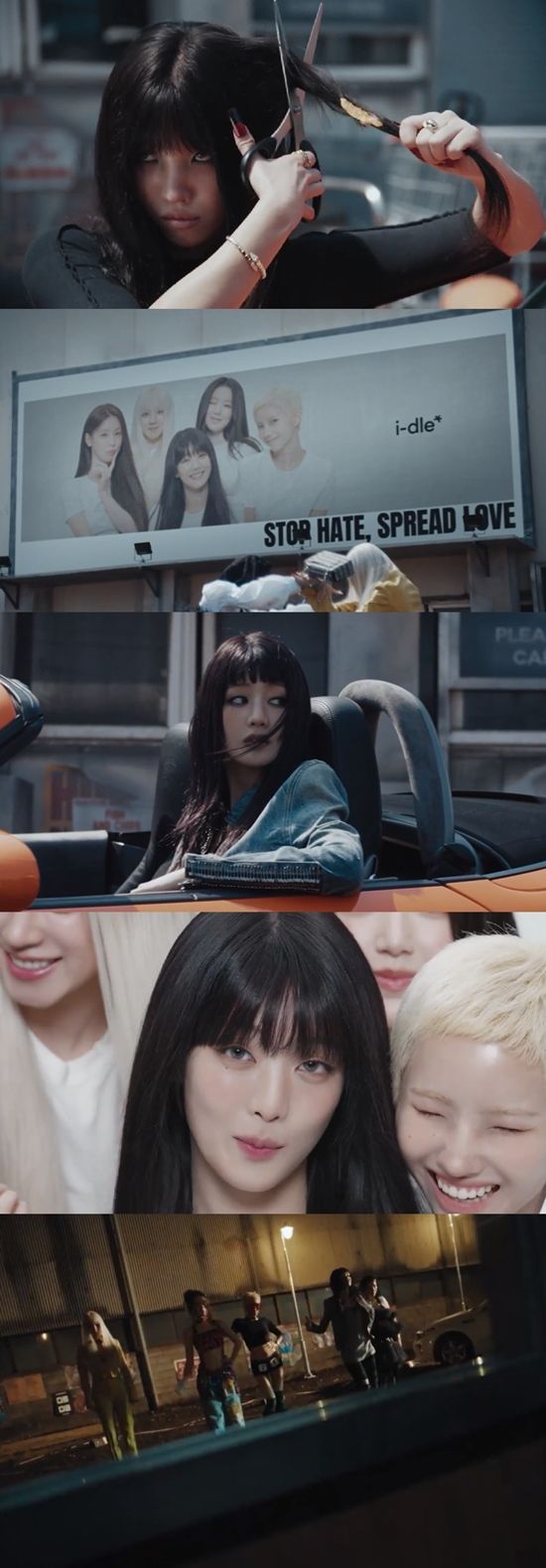 함께 공개된 뮤직비디오는 긴 생머리의 소연이 자신의 머리카락을 직접 가위로 자르는 파격적인 장면으로 시작돼 단번에 시선을 사로잡는다. 이후 아이들은 아수라장이 된 지하철 안에서 소리를 지르고 뛰어다니며 난투극을 벌였다. 여기에 민니가 손가락 욕설을 하는 장면 등 한 순간도 눈을 뗄 수 없는 장면들의 향연이다.