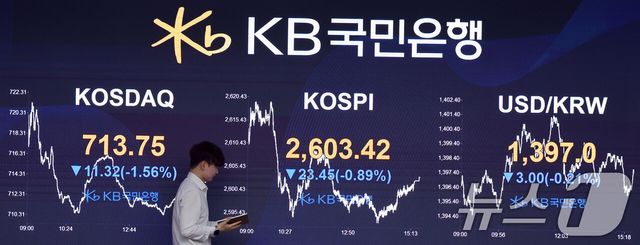 19일 오후 서울 여의도 KB국민은행 스마트딜링룸 전광판에 코스피 종가가 표시되고 있다. 이날 코스피는 전일 종가와 비교해 23.45포인트(p)(0.89%) 하락한 2603.42로 마감했다. 코스닥은 전날 대비 11.32p(1.56%) 하락한 713.75로 장을 마쳤다. 2025.5.19/뉴스1