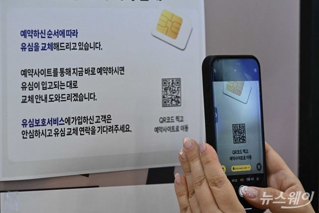 최근 대규모 해킹 공격으로 인해 가입자 유심(USIM) 정보 탈취된 SK텔레콤(=SKT) 이용자가 무료 유심 교체를 하기 위해 28일 오전 서울 시내 한 SKT 대리점을 찾아 QR코드를 통해 유심 교체 예약을 하고 있다. 사진=강민석 기자 kms@newsway.co.kr