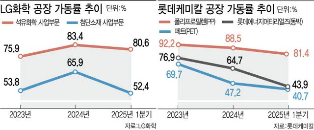 그나마 흑자를 유지 중인 롯데케미칼 첨단소재사업의 폴리카보네이트(PC) 공장 가동률은 지난해 1분기 99.5%에서 96.8%로 소폭 하락했으며 롯데정밀화학(004000)의 가성소다 공장 가동률은 같은 기간 94%에서 102.7%로 오히려 증가했다.
