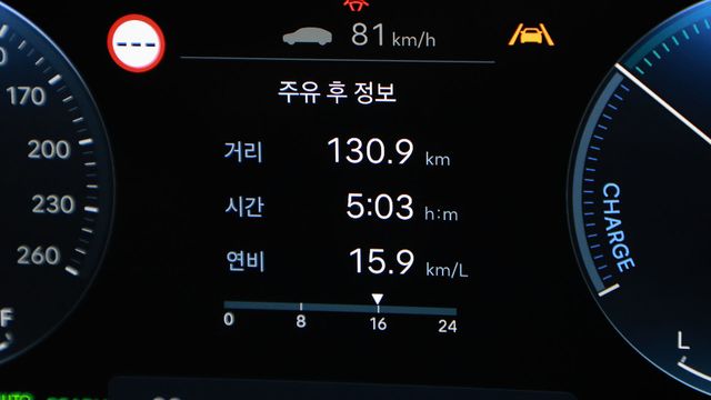 연비 측면에서 직병렬 하이브리드 시스템이 유리할 것으로 예상되지만, 공인 복합 연비 수치는 의외로 큰 차이를 보이지 않는다. 20인치 휠을 장착한 5인승 전륜구동 모델 기준으로, 싼타페 하이브리드는 14.4km/ℓ, 그랑 콜레오스는 15.0km/ℓ, 토레스 하이브리드는 15.2km/ℓ의 복합 연비를 기록했다. 겉보기엔 싼타페의 연비가 가장 낮지만, 그랑 콜레오스보다 145kg, 토레스보다 210kg 더 무겁고 큰 차체를 감안하면 의미 있는 격차라고 보긴 어렵다. 실제 주행에서도 트립 컴퓨터 기준 평균 연비는 200km 주행 동안 16.1km/ℓ를 기록했다. 도심 60%, 고속도로 40%의 주행 환경을 고려하면 준수한 수치다.