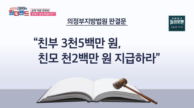 이날 방송에선 아들이 이혼 뒤 맡긴 세 살배기 손자를 17년간 혼자 키운 할아버지가 아들 부부를 상대로 양육비 소송을 제기한 사건이 소개됐다. 여태까지 손자에게 들인 9000만원을 돌려주고, 앞으로 매달 양육비 100만원을 달라는 내용이었다.