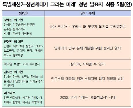 공모전에는 총 60건(팀)의 제안서가 접수됐다. 7인의 심사위원들은 △창의성 △실현 가능성 △논리성 △파급력·사회기여도 △완성도 등 총 5개 항목을 기준으로 서류 심사를 통해 20인(팀)을 뽑은 뒤 발표 평가를 거쳐 5인의 발표자를 추렸다. 심사는 해당 분야의 전문가인 정만기 한국산업연합포럼(KIAF) 회장을 비롯해 특별세션2 진행을 맡은 임홍택 작가, 김종현·이현지·김시연 저출산고령사회위원회 청년위원, 최문선 십일프로 주식회사 연구소장과 최은영 이데일리 전략포럼 사무국장 등 총 7인이 맡았다.