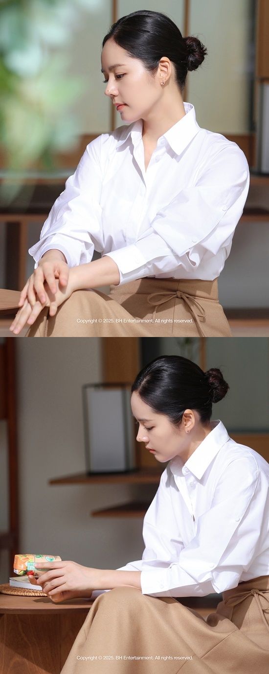 무결점 피부와 고혹적인 눈빛으로 단아한 매력을 자랑하는 한가인은 수수한 스타일링에도 우아한 매력을 뽐내 감탄을 자아낸다.