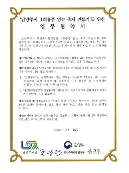 [와이뉴스] 남양주시는 5월 한강유역환경청과 ‘1회용품 없는 축제 만들기’를 위한 업무 협약을 체결하고, 친환경 축제 문화 조성에 본격적으로 나섰다고 20일 밝혔다.
