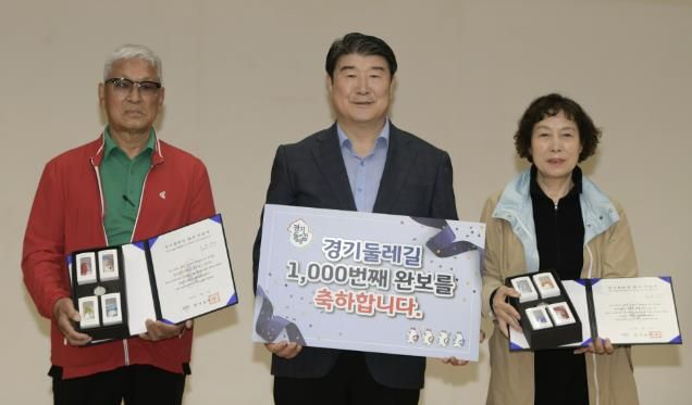 | ▲ 경기둘레길 전 구간 완보자 시상식 (왼쪽부터 성판득 씨(999번째 완보자,이은영씨 배우자), 조원용 경기관광공사 사장,이은영 씨(1,000번째 완보자) |
