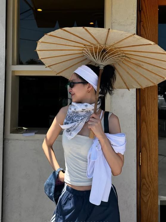 이번 여름에는 트레이닝 팬츠에 나시 하나 입더라도 손나은처럼 헤어밴드 하나, 반다나 하나만 추가해봐. 진짜 느낌이 달라질걸?