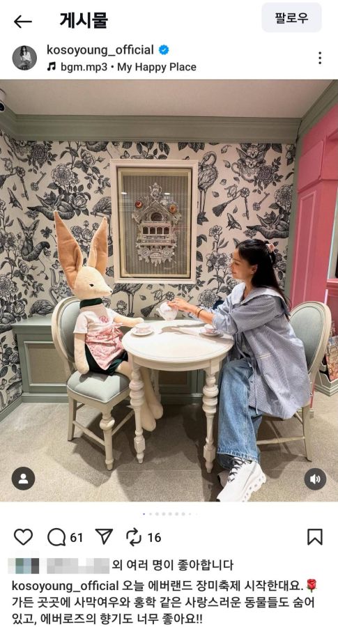 배우 고소영은 "오늘 에버랜드 장미축제 시작한대요. 곳곳에 사막여우와 홍학 같은 사랑스러운 동물들도 숨어있고, 에버로즈의 향기도 너무 좋아요!!",  "퀄리티 좋고 예쁜 굿즈 샵도 그냥 지나치기 힘들더라고요. 동화같은 에버랜드 로로티 놀러가세요"라며 에버랜드 장미축제에 방문해볼 것을 추천했다.