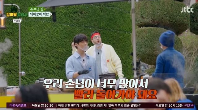 파브리 팀의 적극적인 영업에 손님들이 들어왔다. 파브리는 지치지 않고 냅다 한국어로 “운동하는 사람 에너지 필요하다”라며 말을 걸기도. 운동하던 남자는 다시 돌아와 “넷플릭스 나왔죠?”라며 ‘흑백요리사’를 봤다고 말하며 결국 음식을 주문했다.
