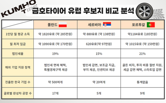 금호타이어는 유럽 공장 건립을 추진 중이지만, 아직 국가 선정은 확정되지 않았다. 현재까지 폴란드, 세르비아, 포르투갈 등이 유력 후보지로 거론되고 있다. 각 후보지마다 장단점이 뚜렷한 가운데 해외 수요 대응뿐 아니라 향후 글로벌 공급망 재편에서도 유럽 거점 확보가 절실한 상황이다.