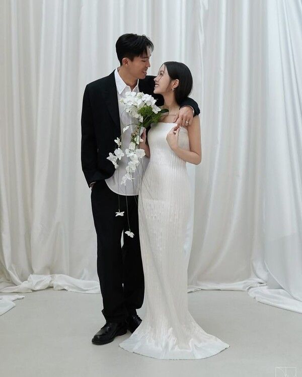 사진 속 정우영은 슈트를 입고, 이연지는 단아한 튜브탑 웨딩드레스를 입었다.