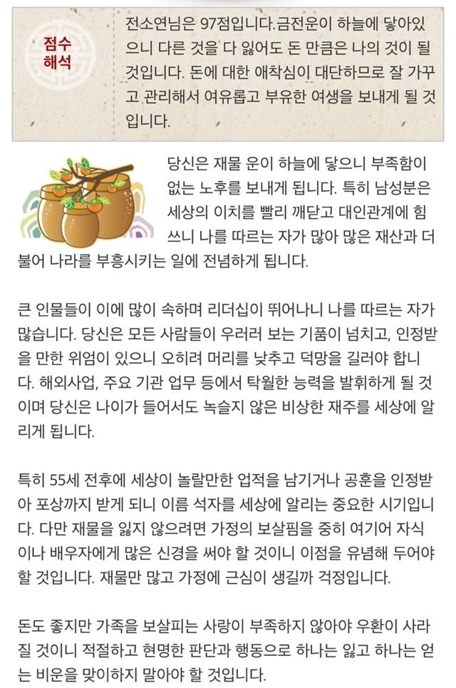 온라인 사주 전문 플랫폼 '위키사주'에 따르면 전소연은 평범했던 유년 시절을 지나 25세 이후부터는 탄탄대로를 달리게 된다. 가정의 경사 그리고 부귀영화가 도래한다. 하는 일에서 점진적인 발전을 이루고 자신감이 생겨나므로 금전적으로 상당한 이익을 얻는 안정적인 나날들을 보내게 된다. 본인이 하고 싶은 모든 일을 다 이룰 수 있고, 풍족한 재물을 모을 수 있으며 무엇을 하든 돈이 따르고 명예 또한 따라 승진이 빠르고 재물을 모으는데 막힘이 없다. 의식이 풍족하고 나를 도와주는 사람이 있어 경제적으로 어려움은 없다. 말년 재물운도 하늘에 닿으니 부족함이 없는 노후를 보내게 된다. 리더십이 뛰어나 따르는 자가 많고 기품이 넘치고 인정받을 만한 위엄이 있다.